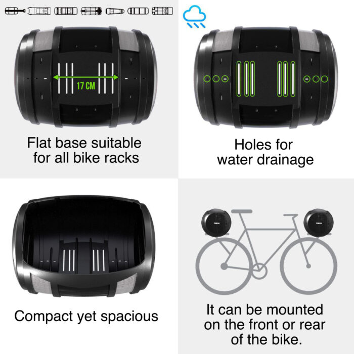 Universal Compatibility: Fits all standard bike racks up to 17 cm wide, and can be easily mounted on both the front and rear of the bike.
